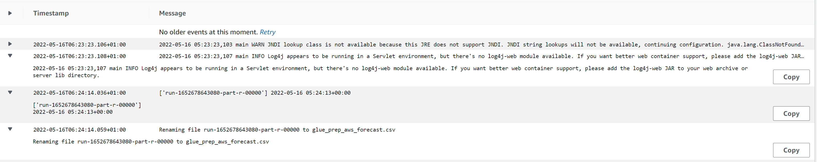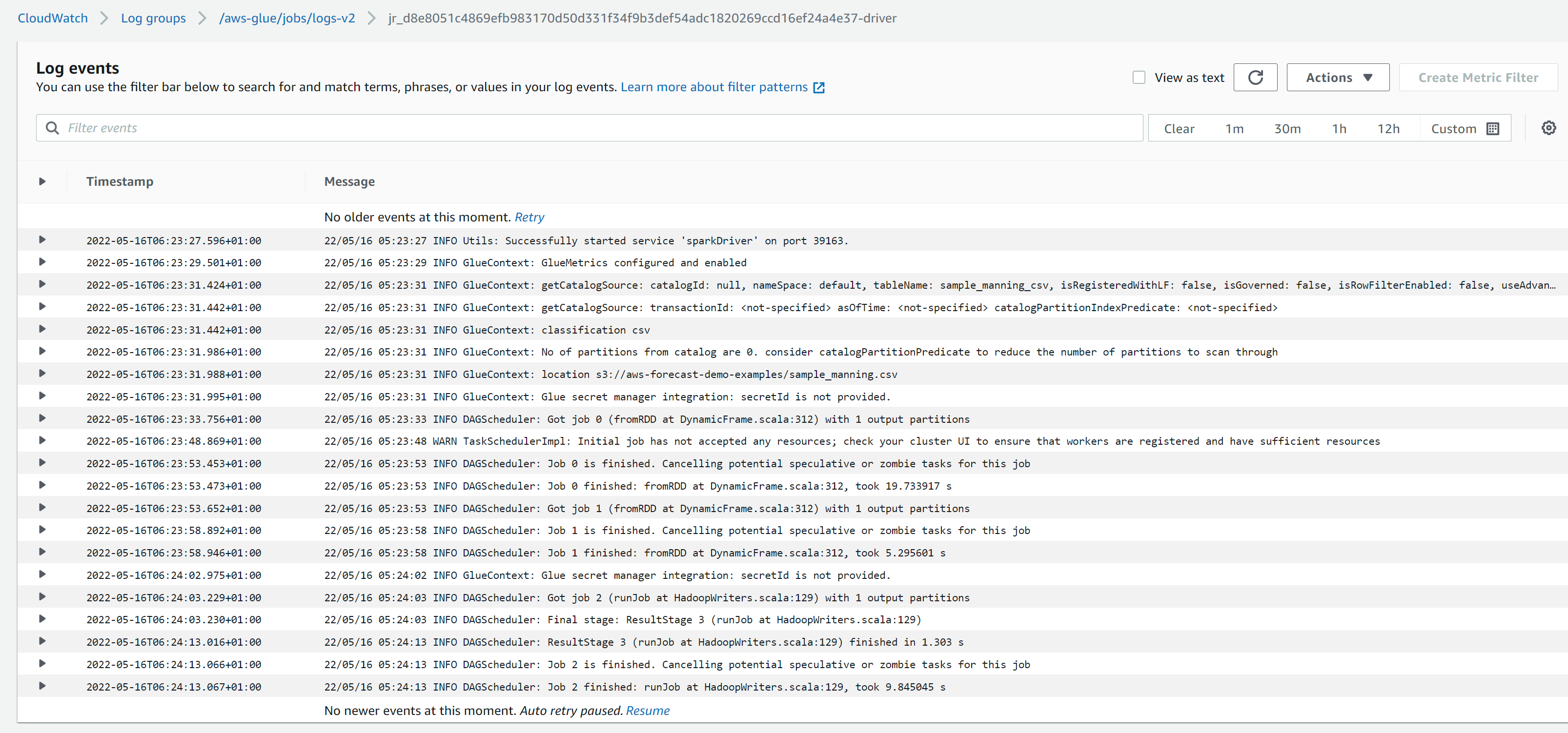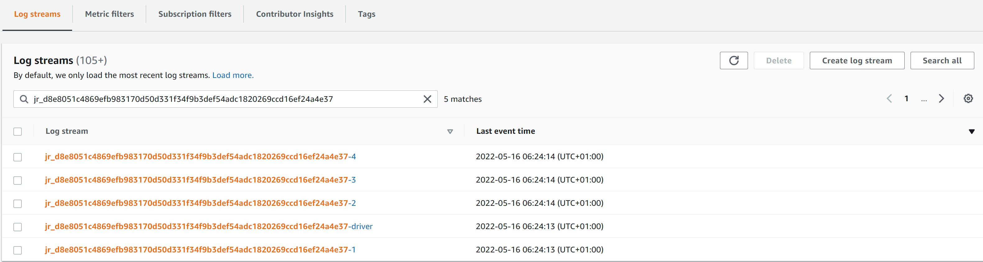 Checking the glue logs, we can see a separate log stream for each worker node, including the driver.