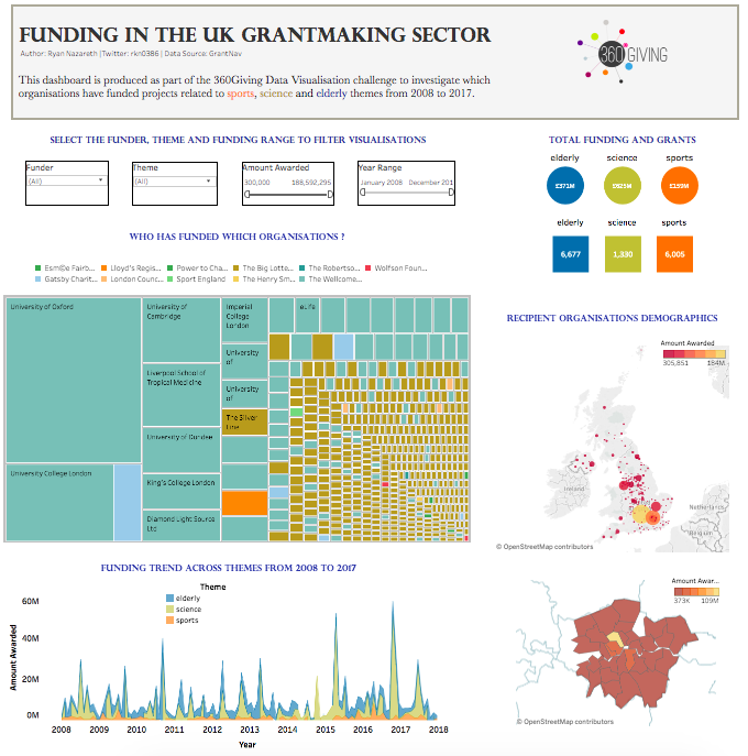 The results show that the elderly and sports themed projects receive the most grants (over 6000) whilst the sports themed projects received the most funding of around £625M (with less than a third of as many grants as the other two themes). The Big Lottery Fund and Wellcome Trust account for majority of the funding across all themes as seen in the treemap, with the Gatsby Charitable foundation and Lloyds Register Foundation also making large donations above £3M. It’s interesting to note that the Big Lottery fund contribute more smaller grants (large number of smaller brown squares), whilst the Wellcome Trust contribute relatively fewer grants but the value of each of the grants is much larger (larger blue squares). Science Theme The top recipients seem to be around the London, Oxford and Cambridge region which is home to a number of these universities like UCL, Kings College London, Imperial College London, London School of Tropical Medicine and Hygiene, University of Oxford, University of Cambridge. Up north, Liverpool gets the most funding (home to the Liverpool School of Tropical Medicine) followed by Manchester, parts of Yorkshire(Sheffield, York, Leeds) and Newcastle. Unsuprisingly, the Wellcome Trust which is a major research charity funds most of these university and research institute projects. £625M went into funding science research during this period. The line chart shows prominent peaks around April 2015 (£47.7M), October 2016 (£51.1M), Sep 2010 (£32.6M), April 2013 (£26M). We can see peaks at regular intervals with periods of little funding in between – which reflects the fixed term nature and specific timing of commencement of research projects. Elderly Theme Here we find the demographics a lot more clustered than the science theme with the Midlands, North West, South West and Northern Ireland regions receiving the most grants. Within London, Camden, Westminster, Islington and Kensington boroughs received the most funding. Around £371M went into elderly themed projects during this period with a total of over 6600 grants funded. Again Welcome Trust contributed a larger chunk of the donations (mainly between £2M to £15M) during this period predominantly to universities. The Big Lotter Fund contributed a large number of smaller donations (between £300000 to £2M) to old age related charitable organisations with notable donations between £4M - £10M to Alzheimer’s society, Social Finance Limited and The Silver Line Helpline. The line chart shows prominent peaks around March 2011 (> £15M), April 2012 (£14.5M) and August 2013 (£12.3M). It seems the period between 2011 and 2014 was particularly strong in terms of funding (compared to 2008 – 2011) followed by a dip between September 2014 and March 2015. Funding in this theme is more distributed over time compared to the science theme which has peaks at intervals. Sports Theme £159M worth grants were funded during the period between 2008 to 2017, with the top contributors Wellcome Trust and the Big Lottery Fund funding mainly universities and charities/communities respectively. Sport England funded a project worth over £1.1M at the Redbridge Sports Centre and the Power to Change made smaller contributions just over £300000 to a Community Trust and Association. The demographics are more clustered around the Midlands, North West, Yorshire region, Cambridge and South East. Liverpool, Birmingham, Cambridge and Leeds received the most funding (over £3M). Within London, the funding was more distributed across the central part (compared to the other themes) with Camden, Tower Hamlets and Southwark boroughs receiving the most funding (over £1.7M each), and other recipients in South (Bromley, Croydon) and East London (Barking) also benefiting from grants The line chart shows a strong period of funding between Jan 2009 to October 2009 and Nov 2015 – July 2016 with over £3M worth grants being funded during this period.