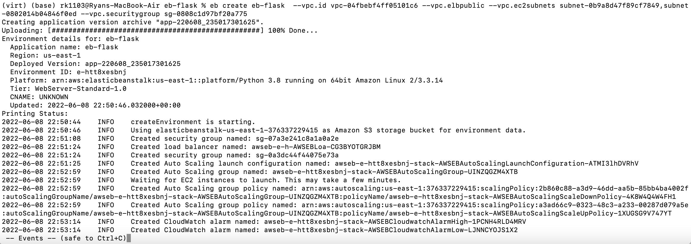 $ eb create eb-flask --vpc.id vpc-04fbebf4ff05101c6 --vpc.elbpublic --vpc.ec2subnets subnet-0b9a8d47f89cf7849,subnet-0802014b04846f0ed --vpc.securitygroup sg-0808c1d97bf20a775