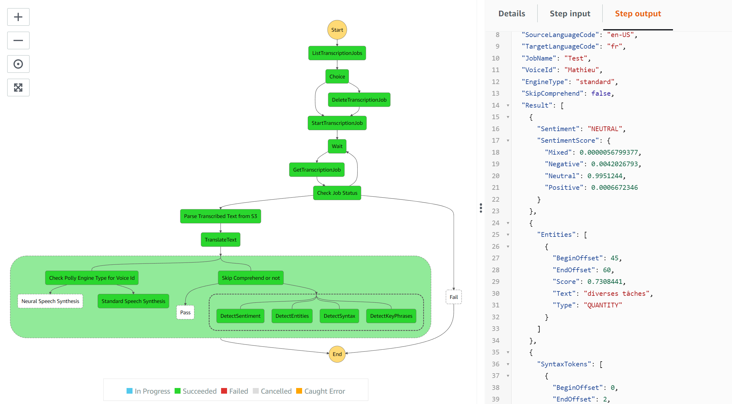 The following execution translates to French using voice id ‘Mathieu’. This is a standard engine and the flow passes it ot the appropriate task. Since French is supported by all comprehend services, the parallel block is executed.