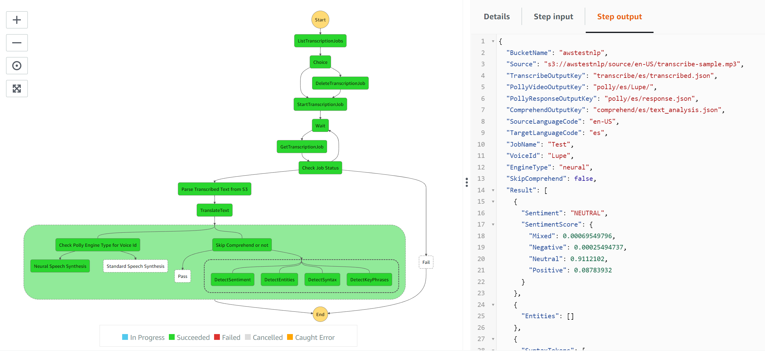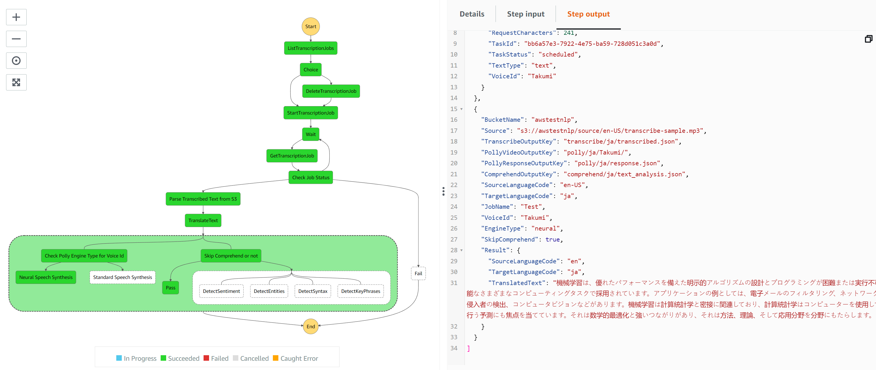 This execution translates to Japanese using voice id ‘Takumi’. This is a neural engine. However, the language is not supported by all the AWS Comprehend services used in the state machine and hence the choice task will skip this
