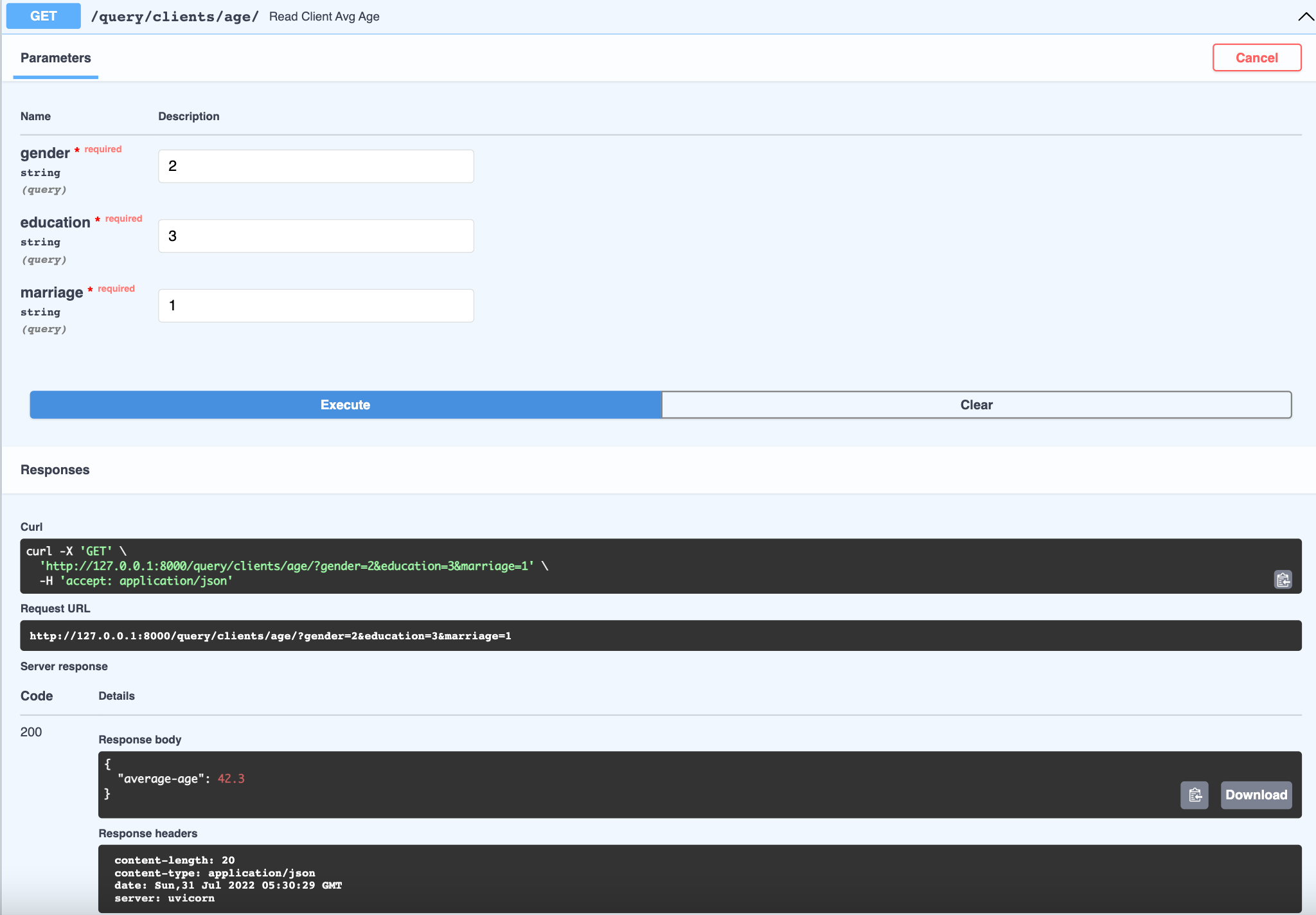 The @app.get("/query/clients/age/") path operation expects query string parameters (key-value pairs). Since the function parameters are not part of the path parameters, they are automatically interpreted as “query” parameters by Fast API [5].This will query the clients table and filter using the query parameter values , and then compute the average age for the filtered list of clients. We have declared all query parameters as optional, by setting their default to None. So we could specify either all or none of the attributes to filter the table by. If none are specified, then the average age is returned for all the clients in the table.