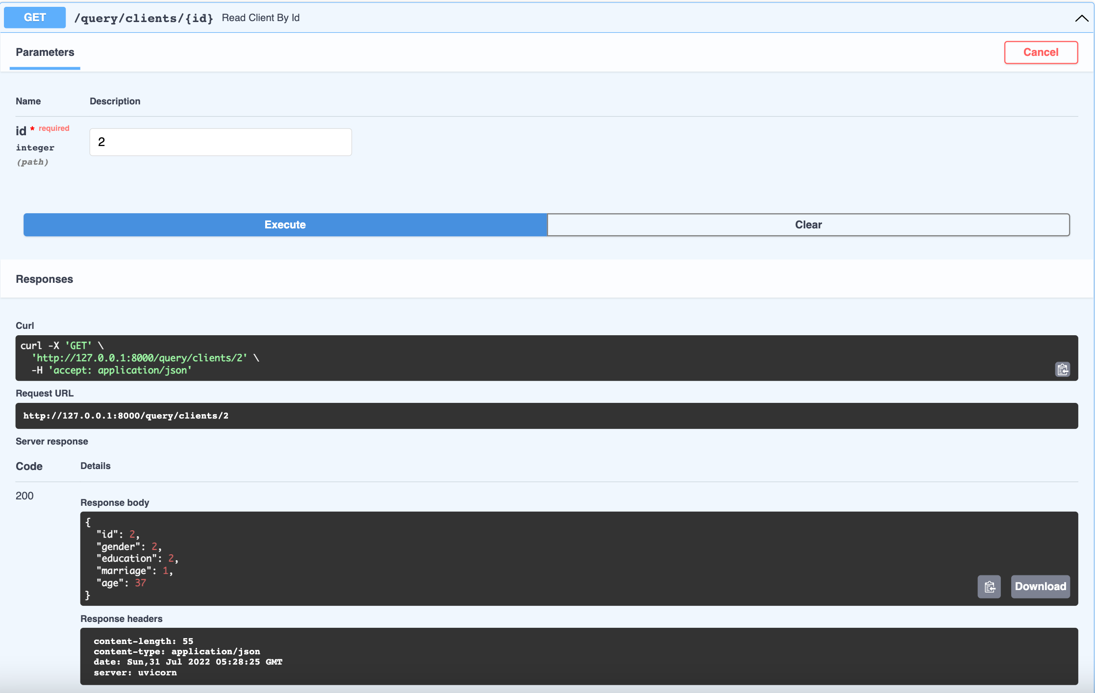 The @app.get("/query/clients/{id}") route expects an integer as a path parameter [4] for the id value. We will then take that parameter and query the clients table to return client id having the id value passed. When testing, make sure you are using ids that exist in your database.