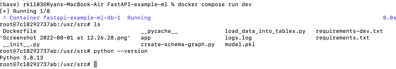 We can now start the dev service container by running the command docker compose run dev If the command ran successfully, we should be inside the container shell as we specified bash command as entrypoint in dockerfile. We can then check the code is correctly copied over during the build phase and that we have the correct version of python etc