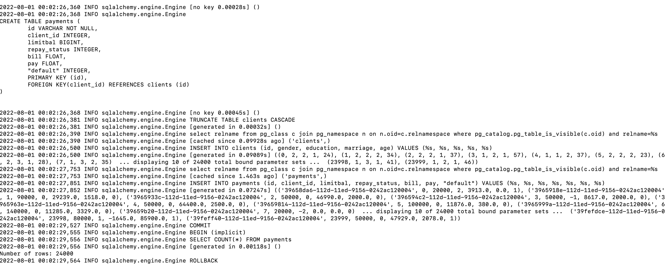 First we need to udpate the client and payments table in the postgres database. we will be using data packaged in the pycaret library, which is based on a dataset from UCI called Default of Credit Card Clients Dataset (https://archive.ics.uci.edu/ml/datasets/default+of+credit+card+clients).