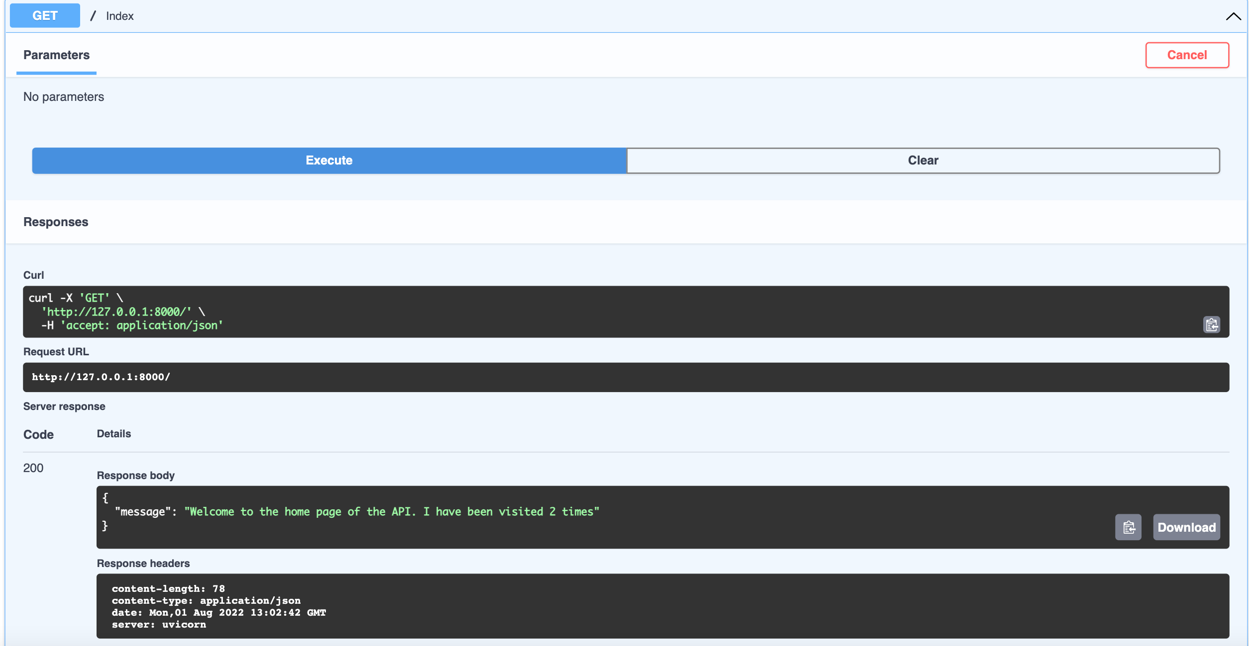 The main.py module defines the path operation functions and decorators and the app object which is an instance of the class FastAPI. This will be the main point of interaction to create your API. This app object is the same one referred to in the command to run the live server with uvicorn in the Dockerfile CMD. The great part of FastAPI is that it takes care of API documentation out-of-the-box. To view the API documentation we can go http://127.0.0.1:8000/docs as we have added port forwarding to forward traffic from port 8000 to port 80 where server is listening on.The automatic documentation uses SwaggerUI. See below: