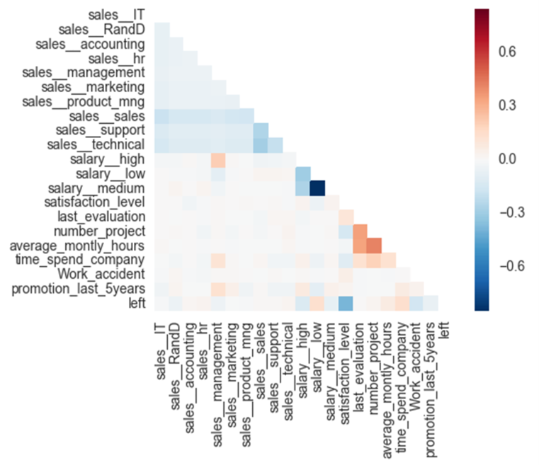 Most of the features show only very little correlation with each other as well as with our “left” target variable. One strong correlation can be observed between the target variable and the satisfaction level of approximately -0.5.