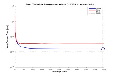 An early stopping criterion was set so that the training terminates if the validation error continues to increase for a certain number of iterations [2]. The validation and training errors normally decrease during initial training but as the network starts to overfit, the validation error increases. In such a case, training would stop once a certain number of iterations have passed [2]. The best validation performance (mean square error: 0.015), was recorded at epoch 493 when the training stopped before the maximum number of epochs (500) were reached.
