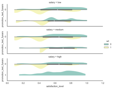 The violin plot shows the satisfaction level grouped by the salary and promotion_last_5years features. The yellow colour represents the employees which left the company. From this plot, we can conclude that the salary level is not a strong predictor but that some features such as salary and promotion_last_5years together can enhance our model’s predictive capability.