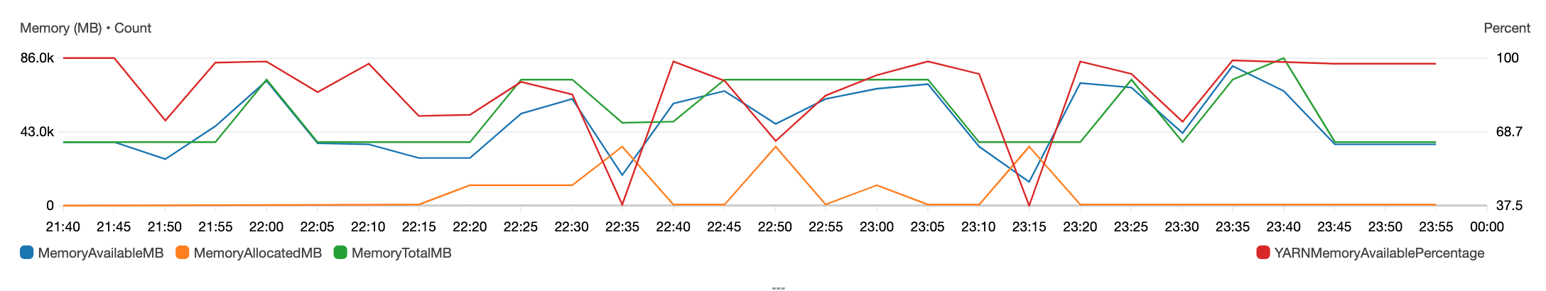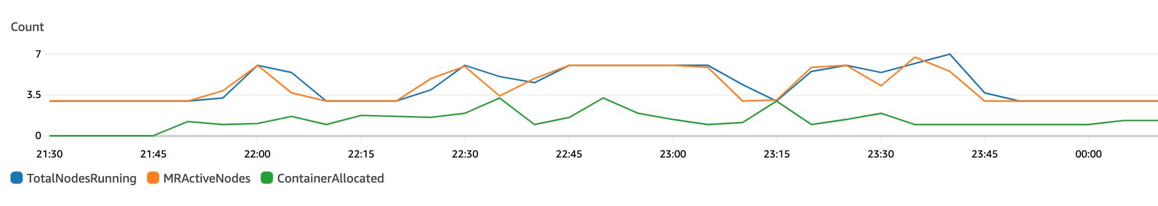 You can view the metrics that Amazon EMR reports to CloudWatch using the Amazon EMR console or the CloudWatch console. From the cloudwatch console, navigate to ‘all metrics’, ‘EMR’ and in the ‘jobflowmetrics’ column, filter by cluster id e.g. j-B857LVXYQNH5. Tick the corresponding metrics to see the graph being updated with the metric overlayed (as in the screenshots below).You can see the selected metrics in graph metrics tab or run queries to get further insights