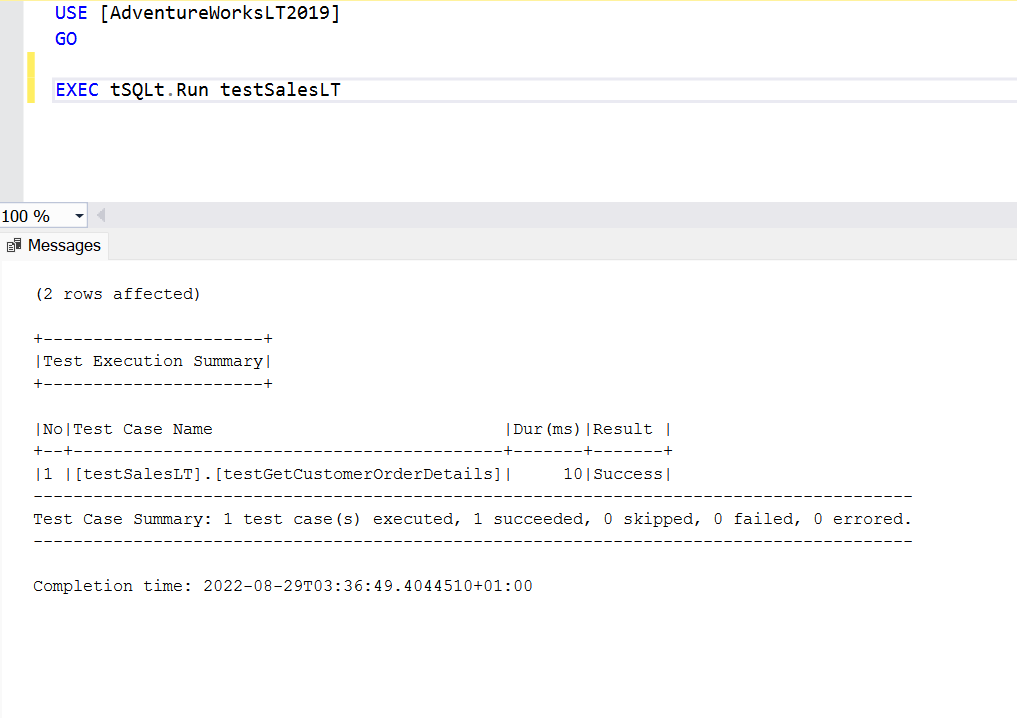 Now we can run the test_company_address.sql script described above and create the test stored procedure. Now we can run the test case using EXEC tSQLt.Run testSalesLT. When we run the test case, it should evaluate to true and return the following results: