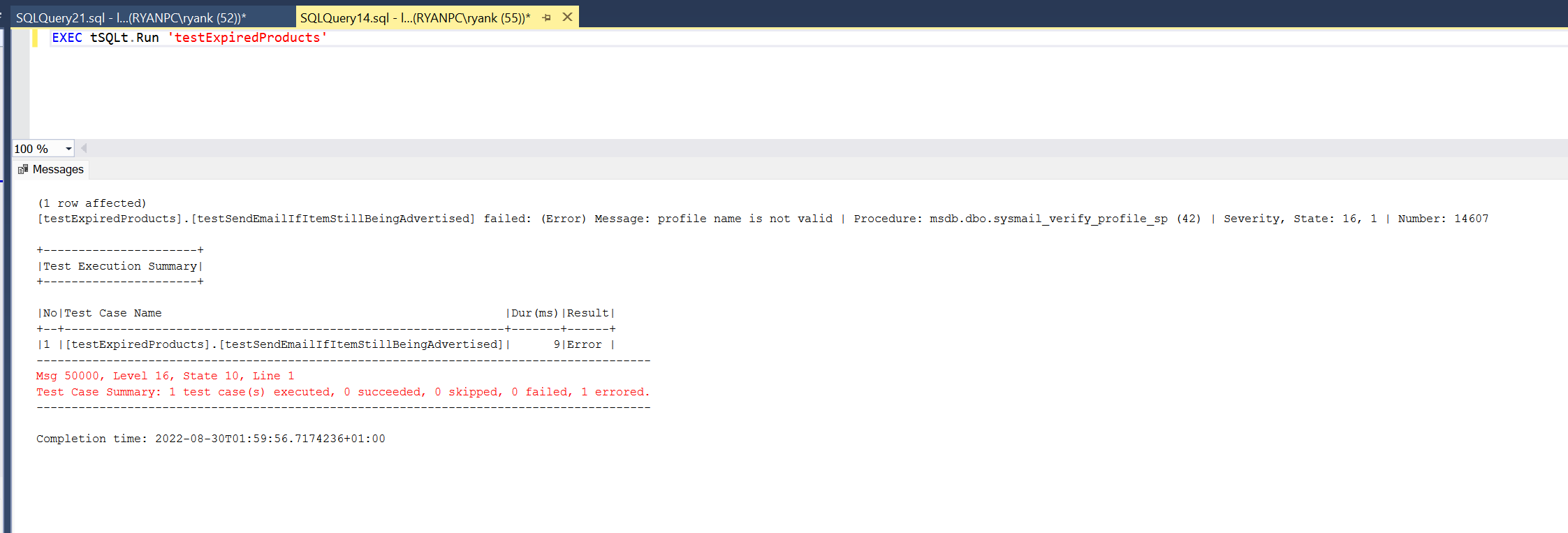 In the above examples, if we did not have the spy procedure i.e. did not include ` EXEC tSQLt.SpyProcedure ‘SalesLT.SendMail in any of our test cases, we would get the following error as we have not actually configured a profile for joe bloggsfor sending an email to using the system stored procedure sp_send_dbmail`.