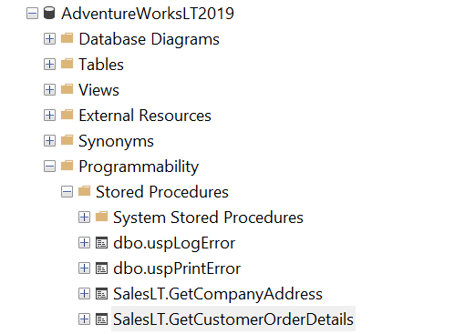 We have a number of stored procedures and functions in this script and the associated tests for each of the stored procedures stored in the tsqlt folder. Open the sp_and_func.sql script in SSMS console and execute it. We should see all the procedures created in the object explorer with the SalesLT schema.